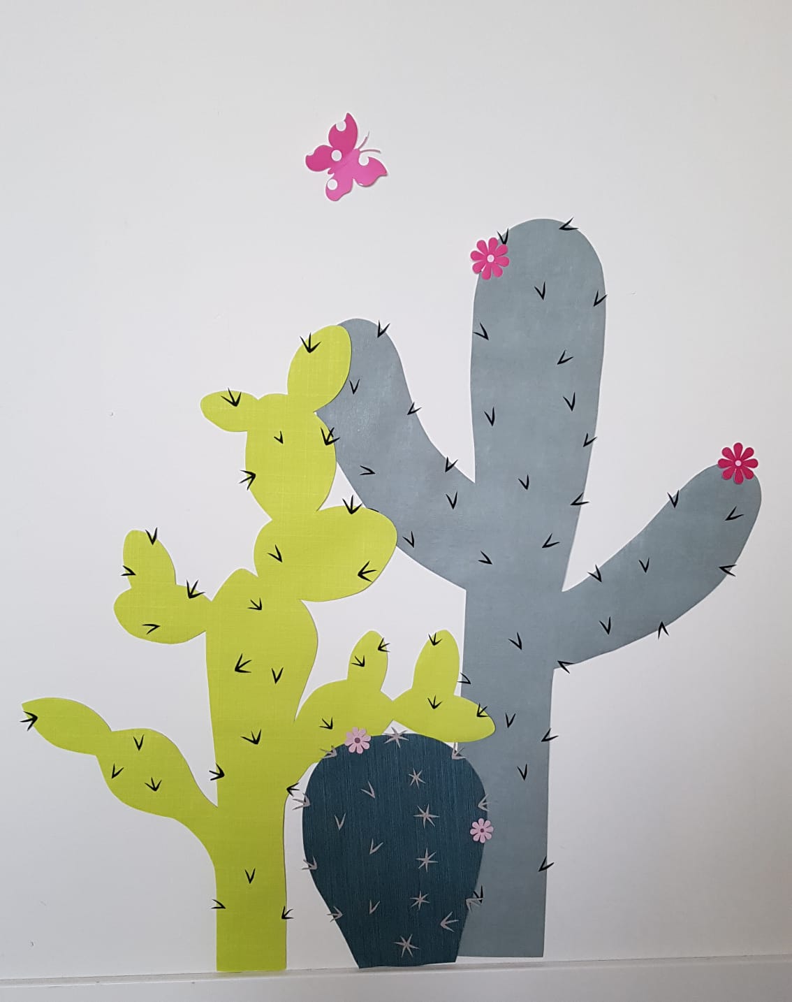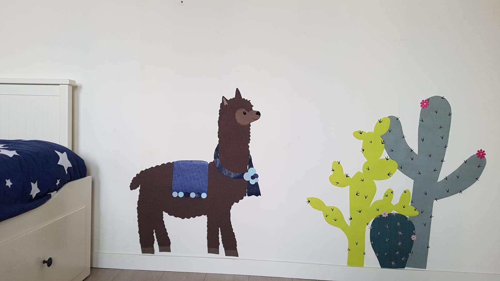 Na de eerste voorbeeldfoto’s gemaakt te hebben, bleef het maar door mijn hoofd spoken of er niet ook een tak of behangboom bij zou moeten. Hoewel 2 alapaca’s op de muur al een muurvullend geheel zijn, wilde ik toch de keuze bieden voor een behangboom erbij. Ik kwam erachter dat de alpaca leeft in de koude hooggebergte, waar helemaal geen bomen groeien! Dat was even een teleurstelling, maar ik zag al gauw dat er wel prachtige cactussen groeien! Deze cactussen zouden een mooie aanvulling zijn om een kinderkamer aan te kleden.