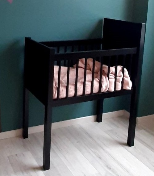Het wiegje heb ik 2e hands hier in het dorp gescoord, deze was wit en heb ik zwart gelakt. We hebben ook nog een ledikant die we later neerzetten ook deze is 2e hands gekocht en zwart gelakt. Het verven van de meubeltjes en de muur vond ik een leuk klusje wat ik met plezier heb gedaan!