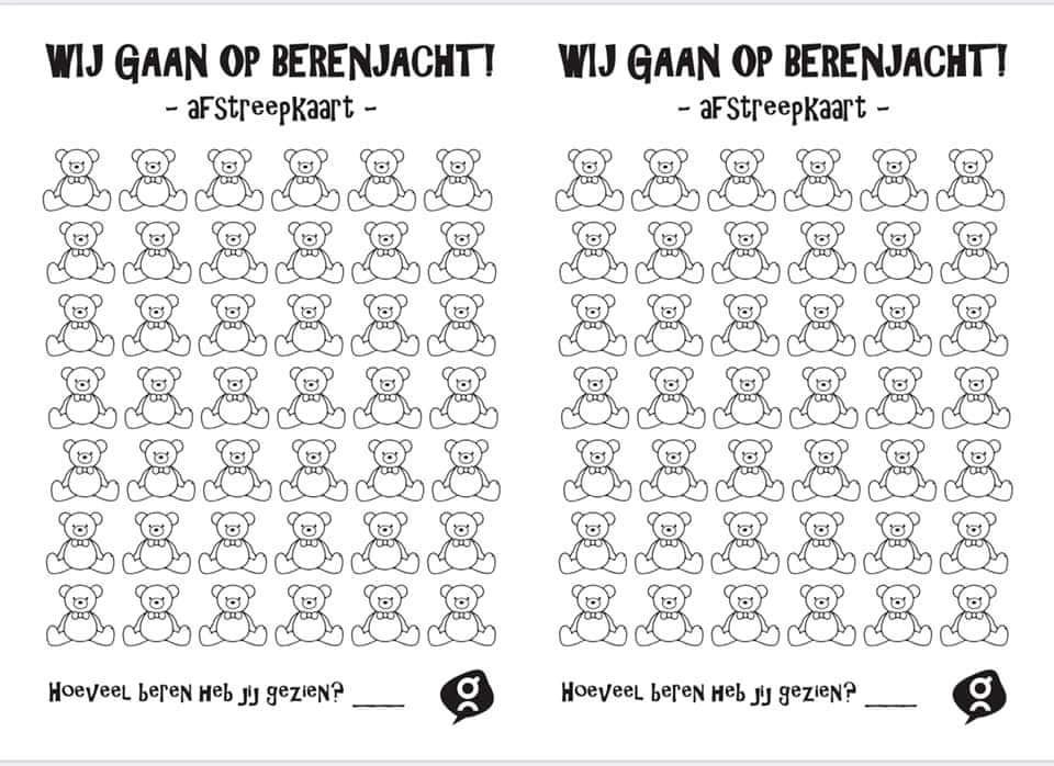 Het tweede idee ontstond toen we op berenjacht gingen in onze wijk. Misschien heb je er al van gehoord en heb je zelf ook een beer voor het raam staan. De berenjacht is een initiatief dat is opgezet in Nederland toen het Coronavirus er voor zorgde dat de scholen moesten sluiten. De speurtocht is gebaseerd op het prentenboek: “wij gaan op berenjacht“, van Michael Rosen. Door op zoek te gaan naar beren, die mensen voor hun raam plaatsen, zijn kinderen even afgeleid en kunnen ze alle beren afturven of de afstreep-bingokaart die je online kunt vinden en downloaden. Wij hebben de route inmiddels meerdere keren gelopen en verschillende afstreep kaarten gebruikt. Een leuke speurtocht waar wij in onze wijk binnen een uur meer dan 80 beren konden afstrepen!