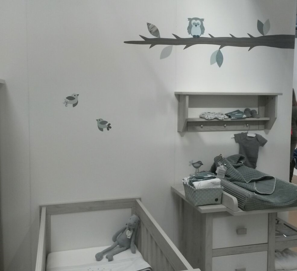 Voor Baby-Dump heb ik al vaker eens wat gemaakt voor de 9mnd beurs. In 2016 ging de behangdecoratie van Uiltje boompje beestje voor het eerst mee met Baby-Dump. De showkamertjes zagen er geweldig uit! In 2017 en 2018 werd er ook behangdecoratie besteld voor de 9 maanden beurs. Daar kreeg ik leuke reacties op. Vooral ook veel vraag naar die specifieke behangdecoratie, want de klanten hadden op de beurs de babykamer meubels besteld en die behangdecoratie stond er zo mooi bij, dat ze ook precies dezelfde decoratie wilden op hun babykamer! Ik denk stiekem dat de behangdecoratie heeft bijgedragen aan de goede verkoop cijfers van Baby-Dump op de 9 maanden beurs, maar dat terzijde.