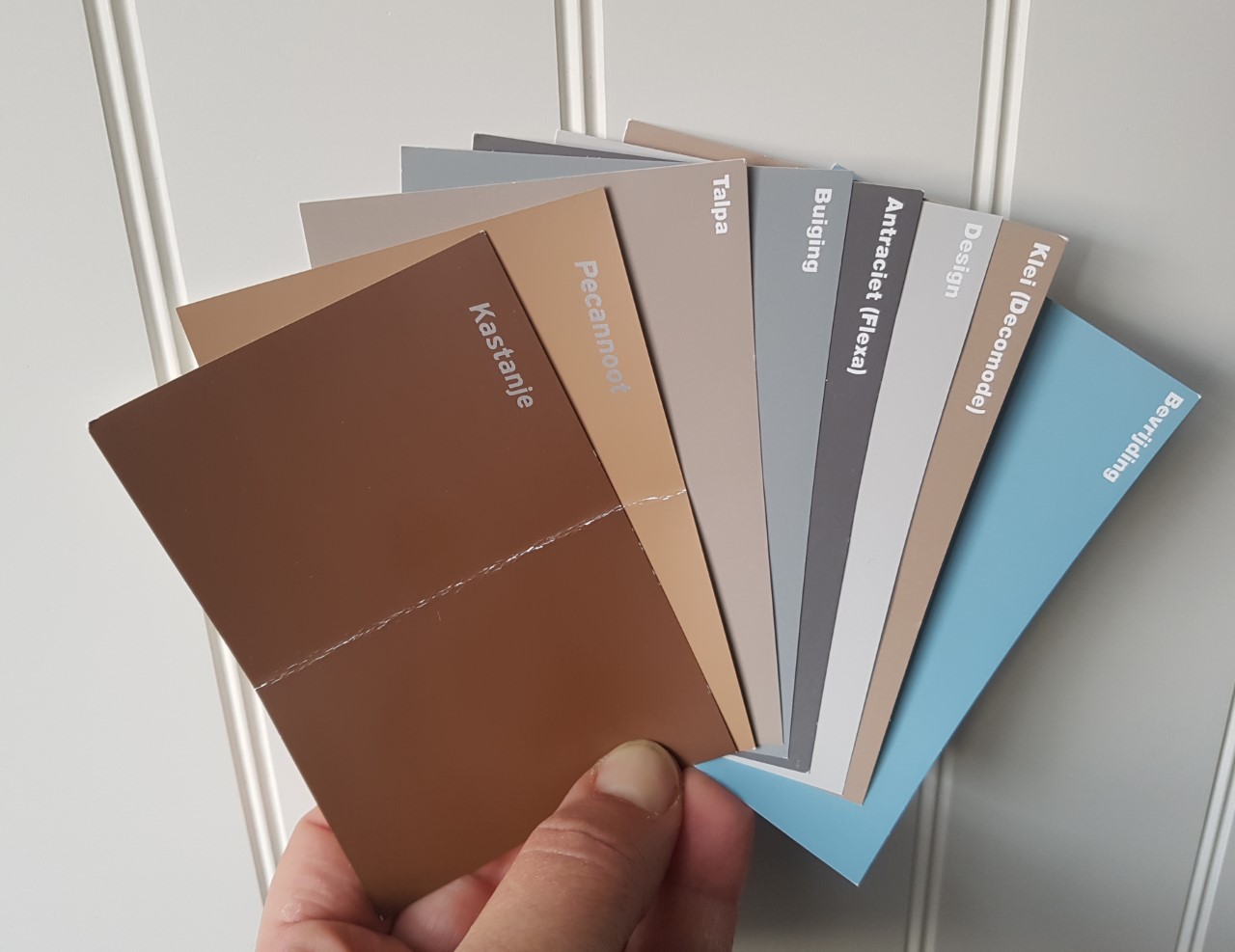Omdat wij een redelijk specifieke basiskleur hebben, hebben wij kleurstaaltjes opgestuurd naar Karlijn. Aan de hand van die staaltjes, heeft zij de boom bij elkaar gezocht. Na wat over en weer gemail, waren wij helemaal enthousiast over het voorgestelde resultaat!