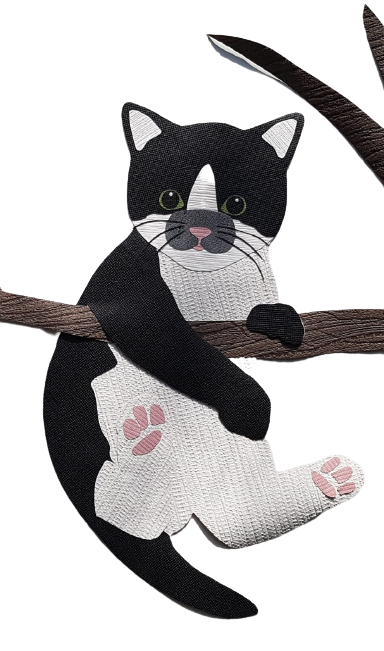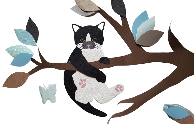 Wij hebben al een paar jaar katten in huis rondwandelen: Joey en Woezel. Dus de kat in een behangtak vonden wij wel passend! We hebben voor een zwart/witte kat gekozen omdat onze oudste kat dit ook is. Daarnaast hebben wij gekozen voor een uil op de tak. De uil komt in de vorm van een (nacht)lampje terug op de kamer .