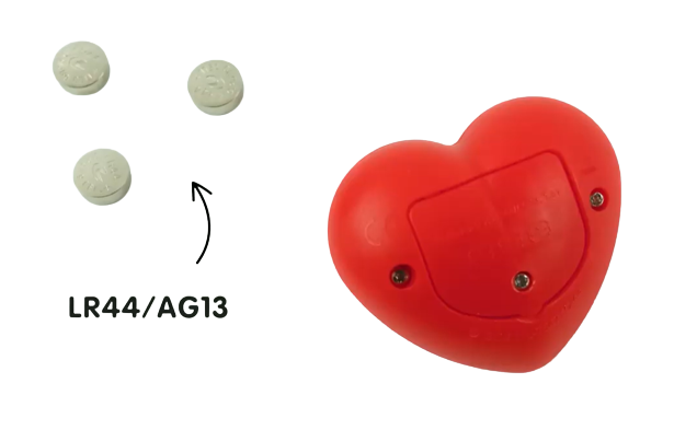 Wanneer je het rode kunststof hart uit de knuffel hebt gehaald kun je het klepje open maken met een kleine kruiskop schroevendraaier, zodat je er 3 LR44 batterijen in kunt doen. Dat zijn van die kleine platte batterijtjes. Plaats het klepje weer terug en schroef het schroefje weer vast.