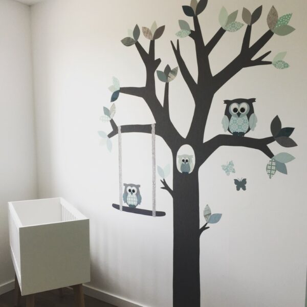 Kies je kleur!Vanaf: €105,99Een geweldige muurvullende decoratie is de behangboom met schommel! Brengt meteen sfeer op je babykamer! De behangboom heeft een afmeting van 230x145cm en heeft een speelse schommel aan een tak waar je een lief uiltje bij kunt plakken. Standaard wordt deze behangboom geleverd met de schommel aan de linkerkant van de boom. Wil je de schommel rechts, geef dit eenvoudig aan bij je wensen. De boom wordt dan in spiegelbeeld voor je gemaakt.